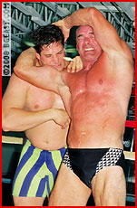 Dave applies a crushing headscissors on beefy Sam