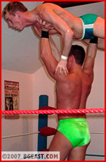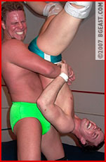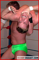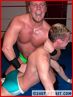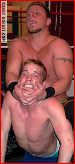 After tossing Cameron from one side of the ring to the other, all with relative ease, Shayn taunts, "man, this is so easy - I'm not even going to break a sweat!" Shayn's extensive experience on the indy circuit soon becomes very apparent, as he moves seamlessly from one brutal hold to another, barely giving young Cameron a chance to do anything besides breathe and scream in agony! The hapless youngster is stretched, bent, twisted, tossed, and slammed in a merciless display of ring expertise that could be hyped at a ring clinic under the title, "How to destroy your opponent!" Despite the brutal assaults that would leave most boys broken and begging for mercy, Cameron is game. Despite the agony his body is experiencing, he never quits and even manages to go on the offensive when he gets the chance - until, that is, Shayn stop the kid's momentum dead with another brutal reversal.