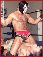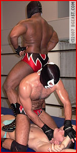 "Pain to rage, buddy!," Max counsels his battered partner as the bell signals fall 2. Alexi and Cage face off again, the still weak Cage again at the mercy of the 'new' Alexi, brutally enjoying the pain he inflicts. But a good tag partner always has your back, and Max breaks Alexi's brutal submission hold with a well-placed stomp to the back. With the Russian staggered, Cage experiences a rush of adrenaline with a single thought: DESTROY. He wants revenge! A schoolboy pin isn't humiliating enough for him, he starts slapping Alexi's face, flexing and taunting as he clamps a brutal claw on him. The Thunder Brutes tag in and out and work him to a brutalized pulp. Finally, Alexi manages to escape, sending Drew in against Cage. But Cage is not to be denied, throwing Drew into the corner and going to work on his helpless form as Max holds him there. Tag! It's Max's turn to dish out the punishment on the hapless rookie. With things firmly in hand, the masked men start enjoying themselves working over Drew, who is unable to muster any kind of offense at all! Well, other than finally getting Alexi tagged in again, but Alexi is unable to get the same break he got in the first fall, and a bulldog, first from Max, and then by Cage, leaves his sexy form sprawled on his back as Cage flexes over him in triumph and gets the three count. Now the score is all even, and momentum has definitely shifted in favor of the masked men. Next page: Fall 3!
