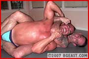 Furious, Derek jumps out of the pool and dares Max to meet him inside on the mats to see who the real man is! The sexy Brit eagerly accepts the challenge, and soon the two are battling full-out out on the mats! Derek is bigger, stronger and more mat-savvy than Max, but Max is scrappy, strong and equally determined to come out on top. As the battle rages and the two work up a total sweat in the humidity of a hot Florida afternoon, their bodies glistening as each punishes the other with some very novel totally intense, and way sexy submission holds!
