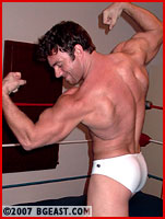 Big Joe, of course, had no idea that The Boss was pulling a fast one on him. The Boss never even mentioned him to Dick! Which was a pity, because Dick remembered the lesson he had taught the newbie quite well. ?Yeah, I remember the big dope,? the cocky stud said when The Boss finally refreshed his memory. ?I can?t believe that dude made it through training! He?s big, dumb, and slow?physically AND mentally. I?ll be happy to take him apart again.? It does, indeed, seem like a mismatch. Dick Rick had quickly established himself at BGEast?not as an up-and-comer, but as an out-and-out star from his very first match! His body is chiseled, his face handsome, his wins many, and he more than knows his way around the ring. Big Joe?s desire for vengeance might turn out to be more than the big guy can handle.