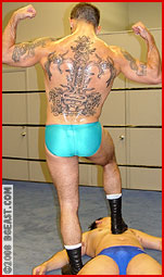 Kevin gets to the ring first, warming up and focusing his mind on ring strategy when his tattooed foe arrives. All that preparation, apparently, was for naught. Derek?s got one thing on his mind, and one thing only: humiliation and destruction! He?s learned a few things from some of the sadistic beatings he himself has endured, and he wants to find out if dishing it out is as much fun as taking it! Pity poor Kevin?the match is definitely not going to go the way he wants! The bell rings, and the beating is on.