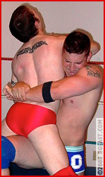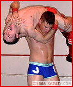 Jaxx pulls Jonny's shirt up over his head, trapping his arms in the sleeves, and just starts whaling on the cocky stud! Jonny manages to work his way free of his t-shirt, and drags Jaxx over to the mats'where the two put on an awesome display of wrestling moves! Despite Jaxx's size advantage, Jonny manages to reverse his way out of everything and get back on top. At one point, Jaxx gets up and laughs, 'Haven't you noticed I'm bigger than you yet?' only to have Jonny fire back, 'Not gonna stop me from kicking your ass!' as he launches himself at Jaxx, bringing the bigger guy down in a brutal cross body scissors! But Jaxx again powers his way out, and puts Jonny down with a vicious sleeper before stalking off to the ring'