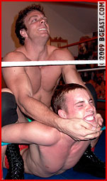 And on the beating goes, with Cameron's chances of mounting any successful offense against the mean monster musclestud slipping away with each passing moment. A vicious bow and arrow with Cameron's body racked around the ring post has Cameron screaming out yet another submission...and before Cameron even has a chance to catch his breath, Dick starts stomping on him outside the ring! Back into the ring they go, and Dick Rick continues his master class in pain! The beating continues, an exercise in viciousness and brutality until suddenly Cameron manages an escape and reversal and quickly and desperately slaps a neck and back-crunching camel clutch on Dick, and now it's Dirty Dick's turn to scream out a submission! But there are consequences to our actions, Cameron!