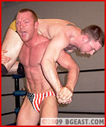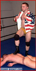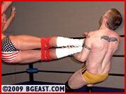 The Kid's down but far from out! A show-boating, too slowly executed suplex results in a roll-up for a near fall. A float-over into a rear mount shows Karisma's got freestyle skills, but that's Jonny's bread and butter. He simply rolls out before returning to ab bashing the stunned hunk. Tit twisters are neither pro nor amateur wrestling, but a page from the playbook of a bully in training, as are two-handed chokes and blatant wedgies. Up a submission courtesy of a tightly applied bck-cracking single leg bostonb, Jonny gets cocky, berating and slapping the bigger boy. When he milks his position a moment too long, the Kid retaliates, scooping him up and crotching him on the ropes. Role reversal! Slams and camel clutches, and suddenly the match is even. But a match is never over when it's over, when Jonny's in the ring. A stunning amount of back 'n forth, this is the hardest-fought match of either wrestler's career. The Kid relishes a moment of domination, flexing while bucking his hips in Jonny's face, until Jonny illustrates the dirtiest and most effective way to counter a schoolboy: headbutt! It's a knockout for one wrestler, and, according to several early purchasers through The Arena, a knockout for the fans too.