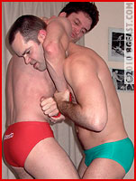Let it not be said, though, that Ty Garrison doesn't know how to take as well as give. Menard squeezes several submissions out of the alpha stud, at one point backing him up to a wall-sized mirror and tormenting his abs, striking them with his closed fists, a glint of malevolent glee in his own deep, dark eyes. In this way, Jean Luc wears tough Ty down one degree at a time. Then he claws at Ty's invitingly meaty pecs, twisting them till the soft-spoken sadist cries out for mercy. But Jean Luc is slow to show any mercy at all, taking malevolent pleasure and his sweet time before releasing Ty from his clutches.