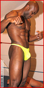 But as the two victorious wrestlers start the leave the arena, the ref stops them. "Hey, this is tag team - It's a 2 out of 3 fall match," he explains - so back into the ring they go! But as they climb through the ropes, Aryx and Myke hike the center rope right up into their groins! As the muscle studs collapse in pain, Myke and Aryx strip them of their trunks, revealing two gorgeous bubble butt-revealing thongs! The ref separates them - and as the bell rings Aryx goes after a still-staggered Tyrell! Payback is Aryx's favorite currency! Clotheslines, brutal kicks and elbow drops - almost a carbon copy of the punishment he endured in that first fall! On and on it goes, until finally Aryx listens to his partner's demands and reluctantly tags him in, sneering, "If you fuck this up I will kill you!" But before they can exchange, Jimmy clocks Aryx from behind and strips him of his sheer transparent trunks! And when Myke rushes in to the rescue, Jimmy levels him with a clothesline as well! Another pair of trunks goes flying over the ropes!