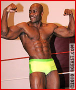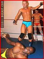 Tyrell doesn't let up his assault as he launches Aryx again. It's Air Aryx! Coupled with brutal stomps, elbow drops and flying forearm smashes, Aryx seems unable to mount any kind of offense - or even defense, for that matter! Tyrell's grin grows as he works every inch of Aryx's defined body, and adds some humiliation by striking a muscle pose with a boot on Aryx's chest as he grovels and groans in agony! "You like that?" Tyrell asks Jimmy with a big grin - and then unleases a torrent of abuse to Aryx's back, lifting him into brutal bearhug after bearhug! Myke launches a drop kick from the corner ropes to rescue Aryx just as he is about to submit - but it doesn't even stagger Tyrell! Back up into Tyrell's arms Aryx goes for the big squeeze - where he cries out in abject submission!