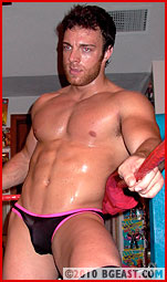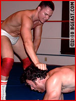A couple of punches to the chiseled abs of the Dickster gives Scott the opening to take to the air with a series of impressive high-flying drop kicks which send the muscle stud flying across the ring! But rather than following up on this newfound advantage, Scott goes to the well once too often. The Dickster ducks out of the way - and the eager babyface is laid out flat! The Dickster wastes no time punishing the kid's back with a series of vicious slams and stomps, alternating back torture with some equally vicious attacks to Scott's shoulder! The war goes on, but the kid manages to kick out of a pin at the two-countl, which sends Dick right back to work on the shoulder again. "This is what rookies get," taunts the gleeful heel stud as his makes the handsome babyface scream in agony.