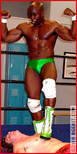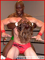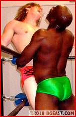 "Now you've pissed me off!" he snarls, yanking on Bobby's trunks to generate more force into his forearm blows to the struggling young man's lower back. Bobby is in deep trouble and increasing pain. He's barely able tog et up off the mat as his opponent's daunting stature and impressive frame loom before him. But standing proud, his huge, powerful tree-trunk legs spread wide, Tyrell poses a big bulging temptation to young Bobby Horton which any aspiring heel would be hard-pressed to ignore! Opportunity knocks!