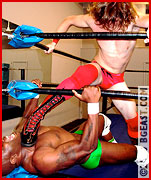 Basking in the afterglow of his first-fall victory, Tyrell poses and gloats. "I thought you said it wasn't all about THIS?" The big handsome bodybuilder taunts Bobby, flexing his huge biceps and admiring himself once again in the mirror. Beautiful beaten Bobby, his long hair flopping around his face and neck, grovels on the mat, holding his hurt ribs and battered back, suffering from the effects of Tyrell's tight and intensely breath-taking bearhugs.