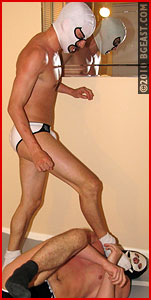 Skull takes sadistic delight in grinding his socked foot on his fallen opponent's face and kicking him in the ribs when he's down. Before Blanco can pull himself off the mat, Skull pounces, working to pry the white mask off his face. Having endured an inhumanly savage assault to his manhood, the threat of losing his mask now pushes Blanco over the edge. He counters, forcing Skull to his back. He sits on Skull's face smothering him and delivers several rapid punches to his chest. With newfound ferocity, Blanco works his foe over, eventually bending him up into a Boston Crab. When Skull growls out his reluctant submission, Blanco pretends not to hear him. When he finally releases the hold, the boy in white plants a loud, gratuitous slap across Skull's ass. In savoring revenge, Blanco's burgeoning bulge is clearly developing a taste for the darker side of wrestling competition.