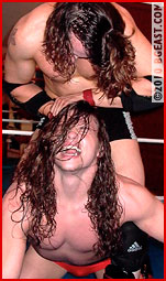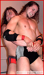 In the end, Bernard and Burns are two sweaty heaps of pain, covered in slap marks, trying to punch, squeeze, yank, and slam more hurt in the other guy. They want victory, to be sure, but they reach a point where pain is its own justification. No prize money or belt could mean more to Bobby than the moment when he makes Bullet scream, "Mommy!" (And that's one moment Bullet would have given up his paycheck if BG East had just agreed to edit it out of the match.) And Bullet's frenzy reaches a point where no amount of money would have talked him out of beating Bobby to near unconsciousness against the turnbuckle. Bad boys that they are, Bullet and Bobby don't stop till one of them is gasping for air in the center of the ring as the victor storms out.