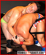 When Austin Cooper takes advantage of an unguarded moment to pay Dick back for the bevy of insults the self-annointed champ just heaped upon him and lands a solid (SOLID) jab to the champ's gut, all hell breaks loose. And hell is in Dick Rick's comfort zone. He cuts loose on the rookie, slamming knuckles and boots to Cooper's upper body, stripping off the man's white shorts to reveal stars-and-stripes briefs underneath, and then using the boxing shorts as a tourniquet on Austin's throat as he yanks off the boxing gloves.