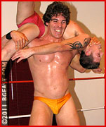 A classic textbook heel in every way, Joe Robbins holds helpless suffering Jayden Mayne in a side headlock and forces him to watch in the mirror as he strikes a single bicep pose. Jayden takes advantage of his opponent's distraction to twist loose and nab the big bully in a hammerlock. But Mayne's advantage is short lived, and the muscle jock smacks him down and then punishes the long lean teen with a brutal back-bending torture rack. The rack is one of many advantages size gives a ring wrestler, and Joe knows enough to use every advantage at his fingertips. One thing he hasn't learned is not to turn his back on a crafty and ambitious young opponent like Mayne. Turning away from the crumpled heap of rookie on the canvas, Joe can't resist admiring his own finely hewn muscle in the mirror. Jayden kicks his legs out from under him, jumps on his back, and starts to choke him out. Joe powers out in the nick of time, but the ordeal has winded and weakened him.