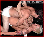 As the fight wears on, Rocco proves to be slightly the more predatory of the two and the more calculating in taking advantage of his opponent's distracted state of mind. Rocco teases the dark-haired boy-next-door sexually, pretending to verge on submission and compliance, only suddenly to deprive him of the prize at the last moment. His sinister smile both threatens and lures. We have never seen anything quite like this. Rocco yanks Jonah's hair and licks the side of his face. He bites. Jonah humps a flailing Rocco, eyes going blank as a blind man's. But then Rocco grabs Jonah's nuts and gives them a nasty twist. Just when we think these two have settled down to roughly negotiated roles of top and bottom, the equilibrium is smashed again, and the fight starts all over. This erotically charged contest, unique in the BG East canon for its unbridled sensuality and anarchic violence, isn't finished till one man has knocked his opponent clean out and can stroke himself against him unimpeded and uninterrupted.
