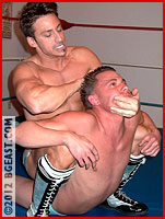 When Louie eventually latches on a full nelson of his own, his effort at exacting revenge amuses his tormentor. "You think this is going to do anything for me!?" he asks, laughing. "Oh, please, come on!" Despite the rookie's arms wrapped around Mr. J's bulging shoulders, it's the veteran who is perfectly in charge, marching them around the ring and leaving desperate Louie hanging onto this tiger by the tail for dear life! Flexing his stunning muscles, Mr. J breaks free with the barest of efforts, tossing the rookie helplessly to his back and digging his hand down his own trunks to adjust the legendary luggage he stores down there.
