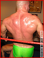 His massive muscled back drenched in sweat, Brute surveys the damage he's done in the ring