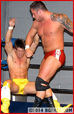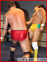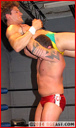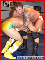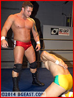 From the moment they make first contact, these men seem deadlocked. Z-Man matches the muscled stud blow for blow, never giving an inch. King shakes his head and flashes a cocky smile with each new turnaround, barely hiding his annoyance at the surprising challenge posed by the man he believed was just a cover model, and is there a hint or worry in his eyes too? Z-Man is in top form, his lean muscles rippling as he tests his strength against a burly bruiser. He's clearly loving every minute of this match as well as the sight of his pro opponent's muscles bulging and sweating just trying to keep up. King actually finds himself forced to his knees in a test of strength, Z-Man's dominance almost unquestionable. But even though he's new to BG East, King is no stranger to the ring, and the pro's years of experience see him through the toughest fights.