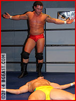 Z-Man catches King in one hold after another. But every time Z-Man thinks he's got the big man down, another punishing blow to his injured shoulder sends him reeling. King is now determined to make an example of the pretty boy who dared give him such a hard time, working first the arm, and then a leg, leaving Z-Man hobbling around the ring. Backbreakers and chokeholds slow down the chiseled cover model, but even hard punches square to his pretty face can't take him out of this fight, even if they do leave him hanging over the top rope. King continues to underestimate the resilient stud and pays for it, suffering and squealing on the mats after each comeback. But attitude and ego can only hold up a body for so long, and in the end one of these men is going down and staying there. The intense back-and-forth action culminates in a shot of one hunk KO'd and laid out at the feet of his still-cocky opponent.