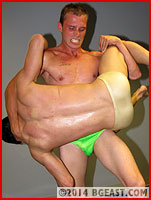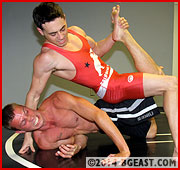 Ray shoves the stud to the floor in frustration, daring the kid to show him what he can do, and Richie obliges, taking his experienced opponent down again and tying him up in a tight submission hold, They take turns as each asks for a submission, and each denies his opponent the satisfaction. At one point, Ray literally tears his own shirt off, warning the kid, "Now you're really starting to piss me off." Richie just smiles and slips out of his shorts in reply. Ray is seeing red now - it's not just the singlet. He dives at Richie and gets caught in a headscissors, his reversals are reversed, and he suffers in a full nelson he can't muscle out of. When Richie relents Ray lashes out with a several sharp ab shots, but that wall of muscle was hardened by Richie's first brutal beating and it will take more than a few hits to break it down.