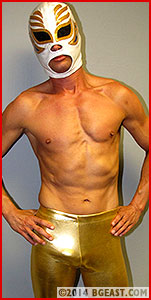 Skip cannot tear his eyes away from the huge, golden package bouncing eagerly at the front of Trey's yellow singlet. "I don't need to imagine what your package looks like," he marvels a the skin-tight, transparent fabric suction packed around his opponent's crotch. "I can see it!" Trey gives his tempting package a hearty tug, taunting Skip with it. "Oh, I'll show it to you!"