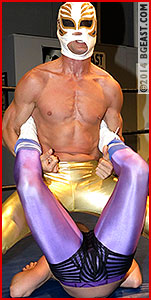 The wrestling is astonishingly brutal and evenly contested as Trey Dixon and Skip Vance dive into their shared gear fetish, starting in masks and tights in the ring. Southern drawls dripping with erotic tension slap down taunting trash talk as momentum is traded back and forth. "Ooo, that mask really looks good on you, boy," Trey coos, staring down at Skip's wincing face trapped snuggly in face-to-crotch headscissors. "Oh, yeah, I think purple is your color!"