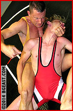 Soon, though, Trey systematically owns his hot little opponent in the ring. Once the bashing and forced stripping is done, it's winner's choice, as Trey digs into his personal bag of fantasy gear, picking out bulge-hugging singlets for each of them to wear as they take this gear war fantasy to the mats.