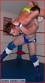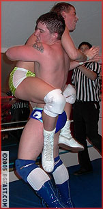 "Ask him ref!" screams Jaxx as Cameron starts to fade in his arms. Cam rallies to his feet, breaks the hold, and throws Jaxx off balance with a sequence of dropkicks and armdrags. Jaxx counters by knocking Cameron down with a hard shoulder block. Cam falls back but immediately springs back up only to get caught with a stiff clothesline from Jaxx! Jaxx goes for a legdrop, misses, gets caught with a dropkick to the face and then a huracanrana that wraps him up for the pin! Jaxx attempts to switch to amateur wrestling but Cameron takes control on the mat and rolls up Jaxx again into a clean pin! Jaxx's mad now. He unleashes a barrage of stomps and turnbuckle smashes that send Cameron reeling. A hot torture rack has Cameron screaming "I give!" But Jaxx wants to send a message with this kid. Sent off the ropes, Cameron catches a JBL style lariat that sends him flipping in midair! A black hole slam from Jaxx rattles his bones, but that's still not enough to satisfy the young villain's bloodlust. Cam tries one last attack only to get dropped on his head by a powerbomb, and not 1 but 2 devastating piledrivers! Jaxx reaches a new level of sadism as poor Cameron is left twitching on the mat.