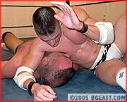 ?You ready for the beating of your life, punk??, Cole threatens the humpy, muscled newcomer in the locker room. When the tattooed stud wins a test of strength one wonders if Cole spoke too soon. Cole-man starts racking up a string of nastily creative submissions, his threat becomes a promise fulfilled. Not content with his submissions, Cole doubles Derek in half, sits on his face does a butt-slapping 10 count. Derek has a massively prominent bulge in his sexy white trunks. And he?s no jobber boy, as Cole learns the hard way! Derek wins a headlock challenge and traps Cole over his knee in a crotch-twisting, gut-punching back breaker. And reaching for the corner turnbuckle offers no respite from the rookie?s attack. Derek tramples Cole underfoot, repeatedly jumping onto his midsection, standing dominant on top of the downed Cassidy?s gut, check and throat. When he finally does make it to his feet, he?s trapped in the corner with Derek standing above him balanced on the middle ropes grinding his big crotch in the tough guy?s face! And when Derek clamps on a crunching neck crank and leg spread combo, it?s Cole who?s crying out in submission. When Cole tries to resume control by yanking on Derek?s nipple rings, he finds himself trapped in Derek?s tight bodyscissors. But what?s worse, it gets worse! Derek traps Cole?s arm, snakes his legs up around his head and traps the budding heel in a triangle sleeper, flips him onto his back and bears his full butt and body weight down on the budding heel. Wisely, Cole quickly submits. No, things are definitely not going the way Cole had planned. Suddenly all his forward BG momentum was being imperiled by a humiliating defeat at the hands of a sexy and surprisingly tough newbie?