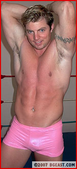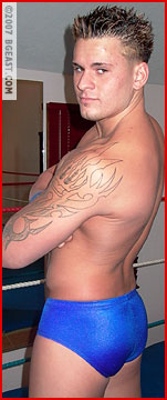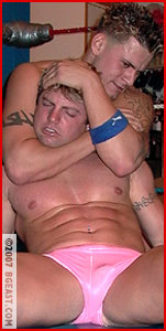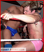 But no matter what Nick might think, Tristan is no clueless muscle boy. He knows his way around a wrestling ring. He's tough and talented - something Naughty Nick is about to learn the hard way! A quick reversal and Nick is groaning at the power of Tristan's legs as they snake around his waist in a brutal cross-body scissors - these muscles aren't just for show! And Tristan has a way with well-placed forearm smashes - as Nick's reddening chest will certainly testify! Tristan didn't put on his trusty gloves just because they looked nice with his trunks - as Nick's aching abs find out as Tristan posts him from corner to corner, landing punch after punch to Nick's midsection! A few body slams, another whip into the ropes, and Nick lands in Tristan's awesome abdominal stretch - with a series of forearm smashes slammed in for good measure. A humbled and humiliated Nick is forced to shriek out a submission to the not-so-clueless pretty boy!