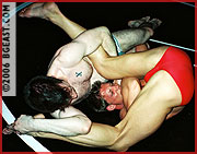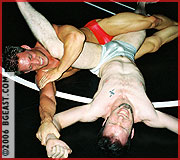 Pleasantries are put aside as the gloves come off! Justin takes charge of the second fall almost immediately with a big brutal bear hug. Glenn, though, is able to reverse out of it and gain control again - and once again starts to taunt Justin. "You're pretty, aren't you? Too bad you can't wrestle." Justin is not to deterred, though, as the second fall goes back and forth, slowly getting more and more brutal and serious. The final fall goes back and forth as both men increase their intensity and their desire to finish off the other in an incredible display of power and strength and wrestling skill. The action gets more and more aggressive as Justin shows a darker side which we never knew was there - but will it be enough to score a final victory over an equally determined and more experienced Glenn? A final neck cracking submission is the determining factor, as one man is left broken on the mat and another leaves the mat in triumph. This may be Justin's best mat match ever!