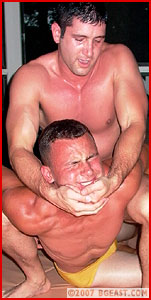 Jim Montello is a sexy young stud who, frankly, no one expected to see again. After all, his debut match was also in the gazebo but against one very mean Mikey Vee, the kind of mismatch the crowds in the Roman Coliseum used to love to watch. But despite the brutality of the cruel beat down that Vee put on the youngster, the kid earned a lot of respect around the company, never more so than when the young stud asked for another match! Even The Boss, not known for his softer side (or for even HAVING one), was so impressed that, rather than doing what he would usually (and instinctively) do and toss the youngster to a lion like the Bodywrecker, Aryx, Vicious or Cole, decided to see what the kid was made of and put him back in the gazebo against Tony Cosenti!