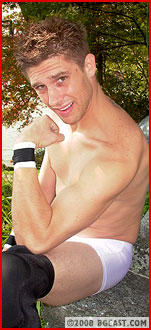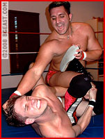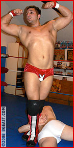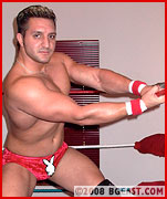 Was it a just year ago that Exavier debuted at BGE? From thrashing the rising Firestorm to being ball bashed and atomic-wedgied by The Marauder, it's been a wild and wide ride. Exavier's star has flamed like a meteor! And speaking of flaming - does anyone on the BG roster have more flamboyant gear?! Here Exavier poses in the mirror, increasingly comfortable displaying his body for his own and the audience's pleasure, his new 'bunny' trunks gracing his beefy bod. But maybe he's too comfortable: "It never fails," he laments when newbie Owens enters. "Whenever I get a moment alone in the ring, someone idiot interrupts." Like a good exhibitionist, he adapts, going so far as to advise the rookie, "Check out these glutes!"