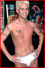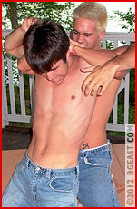 These two have been eyeballing each other all weekend, so BG East decided to give them a match. Rocco is a bit bigger than his last appearance, and Jonah Richards has a bit more experience at BG East than in his early days. Every time they stepped into the same room, the air seemed to crackle. Rocco's leer seemed to freeze on his face every time he caught a whiff of Jonah's pheromones lingering in the hallway. While everybody was stretched out with big plastic bowls of popcorn, watching a late night movie, Jonah licked and bit his lower lip, his eyes locked on Rocco's platinum hair, probably thinking nobody noticed the sudden surge of electricity in the room. Discretely, the two of them asked the other wrestlers what they knew about the other guy: whom he had fought, what his stats looked like, what his favorite moves were. Then, when we called them in to say we wanted to book them for an Undagear match, they said in unison, "Bring it!" In a matter of minutes, they were making their way out into the wild outdoors, to the gazebo mats, pushing and shoving each other, boasting of what they were going to each do to the other, hardly able to wait till they got to begin the trouncing.