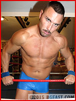 In his own aggressive way, Flash is an appreciative audience to Braden's display of solid muscle, even as he blasts both elbows to the man's rock-solid abdominals. He stretches Charron over one knee and claws his side, where run-of-the-mill guys grow love handles. Next, Flash targets the ripped bodybuilder's legs and grinds his elbow to the stud's inner thigh. Braden taps out, but Flash won't stop, wrenching his opponent in a figure-four hold. Flash saves Braden's back for last. A brutal Boston crab and a killer camel clutch compel bodybuilder Braden Charron to flex the broad panoply of his spectacular back muscles.