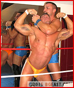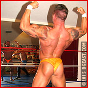 The two lock up, collar and elbow, and Braden pushes his opponent to the corner. Flash retaliates with a heavy-booted kick to Charron's midsection. Flash latches a clawhold onto the bodybuilder's left pec, then stands and grinds the sole of his wrestling boot to the pec before resuming the clawhold. Braden looks stupefied with pain as Flash cranks the pectoral. Braden gives up, and Flash forces him to flex on his knees. When Braden doesn't flex "hard enough," Flash reapplies the pec-juicer, dialing the hurt up.