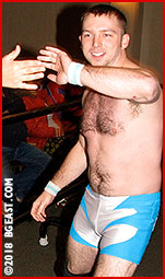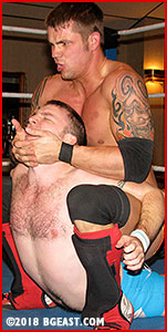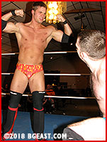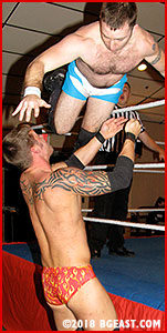 The differences in storytelling techniques between BGE ring and the indie pro ring are instructive. Almost everything in the pro ring is shorthand for the emotions and actions the BGE ring allows to unfold at a more leisurely pace. Holds are held longer for the video audience, maximizing body contact, but abbreviated for the live (the total match clocks in at only about 8 minutes compared to 40 in their BGE private match!). The histrionics are greater in front of a live crowd, and the attacks are more daring, thanks no doubt to greater free space around the ring and the immediacy of the audience response. Opinions may differ, but arguably both are comparably dramatic and erotic, though in different ways. Same opponents, but what a world of difference! Check out this amazing contrast between two of BG East's talented pros, as they battle in the ultimate Grudge Match.