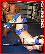 But Ace Aarons is more than just a brutal fighter - he's a skilled technician, as Anton Alvarez quickly learns. Ace moves from one painful hold fluidly into another while all Anton can do is groan, sweat and suffer as Ace works him from one side of the ring to the other. Using the corner to climb back up after Anton finds himself prone on the mat proves to be a huge mistake as Ace moves in for the kill, driving his shoulder into the already battered midsection of the hapless youth. Anton finally manages to surprise Ace with a shocking takedown that staggers the brute - but only temporarily.
