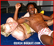 Working a double underhook, Rocky stretches and crushes Leroy from behind with a bodyscissors
