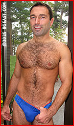 Zach Reno, however, loves this! As he lures his opponent Christian to the outdoor venue, Thorne looks around with a grimace. The northeast autumn is far from Christian's humid Florida comfort zone. Zach seems more than warmed up, sporting only a fully-packed speedo and a nice, furry coat of hair on his torso, while the chilly air bites through Christian's jacket, making him shiver. Reno asks him, why not have their match right there. "Hell NO!" retorts Thorne, pulling his shoulders tighter to himself. Reno is not going to take that as an answer. An involuntary striptease leaves Christian in bulging purple trunks, and Reno's aggression forces him to accept the venue as the action explodes. "I'm going to like two things... Fall and beating your ass!" says Reno, before quickly being shut up by a takedown.