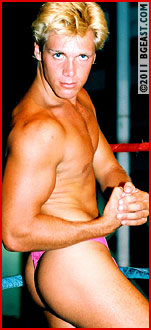 At 27, 5'10', 185, Glen is ripped, rugged and ready for the task at hand: destroy the jobber. After a sensuous pose-off stripdown they circle under the lambent light of the squared circle wearing only t-back thongs -- -Flyboy's is pink!. Glen's bearhugs showcase Flyboy's perfect butt-cheeks which are as James Kirkwood wrote, 'like two duck eggs in a napkin.' Flyboy puts up his fists! Typical dumb jobber makes the BIG mistake. Glen mutters, 'Now THIS is gonna be fun!' As a prelude to a total wipe-out, the hapless prettyboy takes a near-KO pounding.