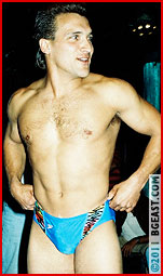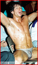 Beefhunk Dave Lowe shows off quite the butt as his cute manager greases up the lightly hairy chested Irish/Italian. The audience loves this smiling prettyboy. They love super aggressive Rev Sutton, lean and tough, even more as he struts and shows off his ripped physique glittering in oil, his trunks nearly instantly becoming nearly see-through as the oil is poured and spreads over his hot muscles.