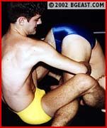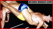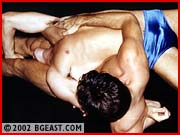Barefoot, they stretch silently in the mat-room. Bass, laconic and cocky as ever, expects an easy victory. But Chip loves to take chances and stops at nothing to get him-self a rung up on the BG ladder. And in the lightweight division versus it's current champ, he's shooting for the stars. Chip grabs at Bass's crotch, and slaps that ass, baiting the bull! You just know some retribution will be forthcoming after that type of insult. Bass methodically and brutally applies his body scissors, painful arm bar and other specialties. Jacknife pins - one face-to-ass - and a spectacular Bass bridge show off some of the assets these handsome fighters possess. The action is rough and very intense and the big baskets, great butts and the terrifically talented wrestling add to the intense sex appeal of this mat brawl.