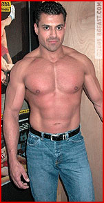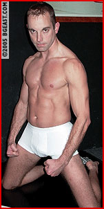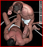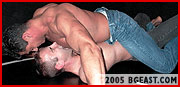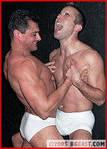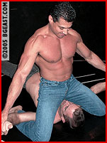 In his return to BG East, Steev gives us a glimpse of what he does to keep those huge mounds of muscle in shape as he pumps up in preparation for his match with Devon. Upon entering the matroom, Steev flexes for an anxious, admiring and drooling Devon, even taunting as he flexes, "Are you SURE you want to take on this?" The glint in Devon's eyes and the stirring in his tight black jeans answer that question fast! Steev wastes no time in making it known just what he wants from this stud, utilizing sexy scissors, sexier schoolboy pins and anything he can think of to plant his growing bulge in Devon's pretty face. Before he knows it, Devon is stripped out of his tight jeans and down to his even tighter white under briefs. Soon Devon is submitting to Steev's superior muscle and howling as his pecs get squeezed and his stretchy briefs get wedgied up his butt-crack! But don't count Devon out just yet! He does some sexy jeans stripping of his own and wraps Steev's denim around his neck before pounding on those big beefy pecs. Things are definitely heating up as the attraction between these two contrasting studs is palpable and obvious. Both these hot hunks are clearly enjoying getting better acquainted! (read page 2)