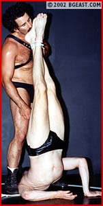 Justin, in black leather vest, shorts, black punk boots, various collar gear is on his knees admiring himself before an oval mirror. The BBW enters, in black leather vest, studded leather chest harness, leather and chain strap over khaki shorts, black army boots. He immediately assaults Justin but it's not his usual bull-in-a-china-shop approach. It's slow and methodical and sexy and erotic. The gear in this match comes off slowly and is often used in the action. Justin gets slapped in the face and spat on, scissored, slammed and smashed down over the BBW's knee. His balls take some abuse and the sight of him holding them and suffering on the mat, his face in paroxysms of pain, is hot. BBW pulls out a rope and binds the prettyboy's ankles and then suspends him in the air. Next come the wrists, then the wrists and ankles get bound together. Unable to resist, Justin gets subjected to even more abuse as the big bear squats on his face, reaches down into those tight leather trunks and has him by the balls, once again squealing in agony. The BBW unties his quarry and then turns the lights down low...and we stay right with them on their mystery tour of wrestling erotica.
