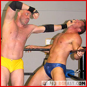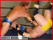 Skotch challenges his studly opponent to a test of strength. They flex, pecs pounding into pecs. It's Mitch's conditioning and height that turn the tide, driving Skotch's knees to the mat and threatening to snap his wrists. The Canadian bear battles back to his feet and shoots a kick toward Mitch's groin to bring the big man down, but Mitch is no doe-eyed rookie. He catches Skotch by the ankle, spins him around, hoists him into the air before delivering an atomic drop onto his knee. BG East's resident dangerous-pretty-boy is all over the Canadian, nearly ripping off his head with a clothesline and hip tossing him back and forth from corner to corner until Skotch can barely climb back up to his knees. "What do you got!?" Mitch yells in face. "So far, nothing!" He flexes his mouthwatering guns and chuckles. "I don't think you're near as tough as you think you are!" Oh really?....