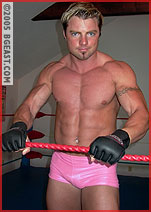 Wow! Kieran is looking incredible in his white-front and green-back trunks. The young bodybuilder has increased his muscle mass, his bubble butt on full display as he works out in the ring. The peace of the moment is abruptly interrupted. Tristan comes to the ring with a male model's attitude and tights to match. He methodically strips off his jacket and workout pants, revealing shiny pink trunks, which Kieran enjoys mocking. Collar and elbow tie-up and we see Tristan's considerable height and size advantage which he uses to easily toss Kieran all over the ring. "Stay down if you know what's good for you" shouts the blond titan. Kieran rebounds with some hiptosses and slams of his own, prompting Tristan to run out of the ring to make sure his hair did not get messed up! Kieran traps Tristan in a hot headscissors, but Tristan wiggles free and delivers a soccer kick right to the nuts! Tristan takes the first fall by almost forcing the fireplug's shoulder out of its socket. Damn, that boy can suffer?