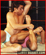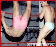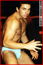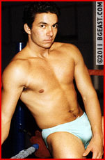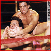 After a pre-bout strip show, bare-assed Nick pulls on his sexy fight duds. Nick is one of those perfect creatures--gorgeous face, beautiful dark eyes, great sexy body, great butt, perfect tanned skin. Exactly the type Ed George, a cool-as-ice tough guy, loves to dominate! After couple of powerful haymakers, he tortures and taunts the gorgeous hunk with a cross body scissors, beautifully displaying Nick's big bulge. One fall, with Nick mostly on the receiving end.