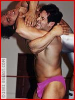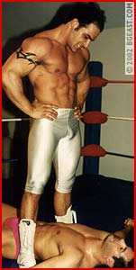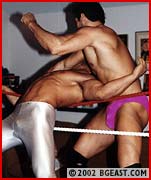 Hunky rookie Davey is thrilled to get into a ring with vet Coltstud Dante. With his schlong clearly visible in butt-hugging sheer white tights, Dave surprises the mouthy vet with his talent. Davey falls for a pose-off trap and gets powerbombed and manhandled in the corner. An awesome backbreaker submission shows Dante's fury. Dave looks great stretched over the ropes as Dante forearms his pecs, backbreakers over the knee, a surfboard, clotheslines and more. Both resort to ball bashing in their all out ring battle, with big slams, rolling headscissors, massive beatings and a very hot, surprising sleeper finish!